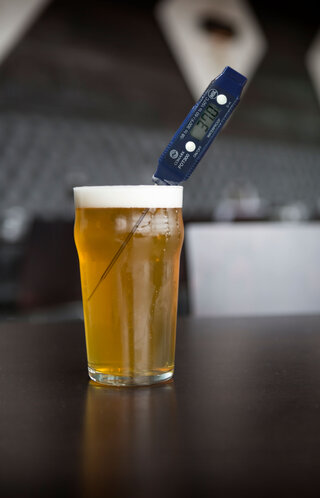 Another method for monitoring the liquid beer temperature inside the keg is to place a glass or bucket of water nearby or on top of the keg and allow it to chill for 24 hours. Then with a calibrated thermometer, determine water temperature, which simulates beer. If beer is being dispensed at a remote location from keg storage, monitor beer temperature being dispensed from the faucet to assure 36-38° F temperature is maintained to the glass.