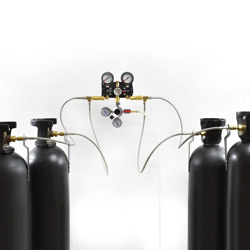 A cost—effective, cylinder switching unit that works with any Nitrogen gas cylinder up to 3000 psi. Provides a seamless switch between the cylinders, ensuring a continuous supply of beverage gas—especially important during peak periods. Easily installed, it works with existing beverage gas regulator and requires no maintenance.