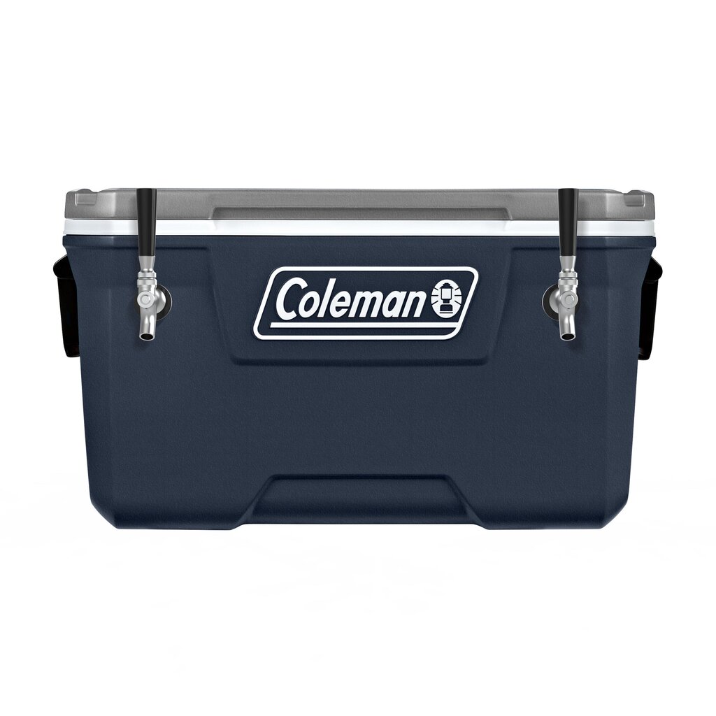 Pour cold draft beer anywhere! Add ice to our portable Coleman 70-quart party cooler; with CO2, you'll pour cold beer effortlessly all day. With TempLock™ FX insulation in the lid and body with four molded cup holders, this is an excellent option for pouring at your next event. Equipped with a tethered drain plug that resists leaks and a liner that resists stains, this sporty Twilight Blue and Rock Gray cooler has a classic appeal. This cooler includes (2) chrome-plated brass faucets with a 5/16" keg connection and (2) 120 ft. coils so you have a steady supply of your most popular beer, and it is fully insulated to ensure the ice and water bath stays at a pleasant chill.