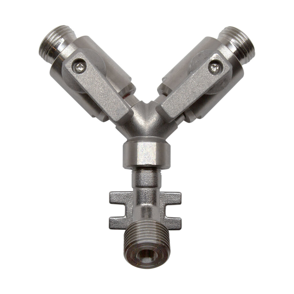 Beer tap wall mount is a "Y" keg to two dispense points. Integral mounting bracket to securely mount switch to walk-in cooler wall.
