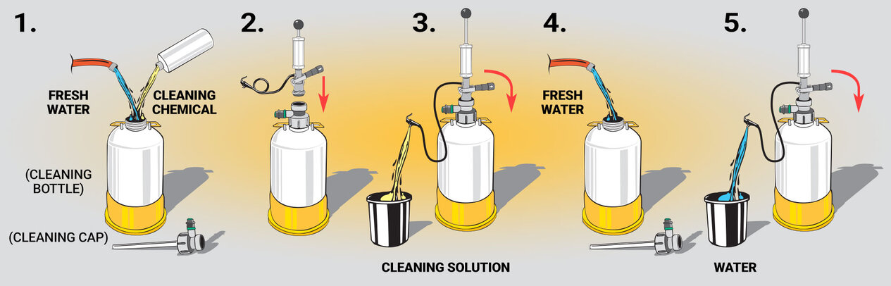 3. Pressurize the cleaning bottle with a party pump and release the cleaning solution by squeezing the faucet, allowing approximately 1 quart to flow out.