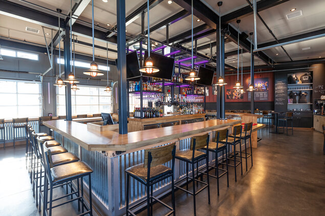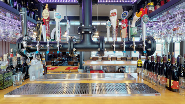 The bar at The Deck is unique, Uzubell says, because it’s in the middle of the bar area rather than being against the wall. “It’s an island bar. People can sit on all four sides; it’s the focal point of the room," he says. What’s most striking about the beer tower is that it hangs from the ceiling. With eight beer taps on each side, it carries out the rustic décor of The Deck, says Uzubell, with “black pipe and large-diameter cast-iron flanges that are bolted connections. It looks very industrial.” With drip trays on either side of the taps, two bartenders can work the room simultaneously.