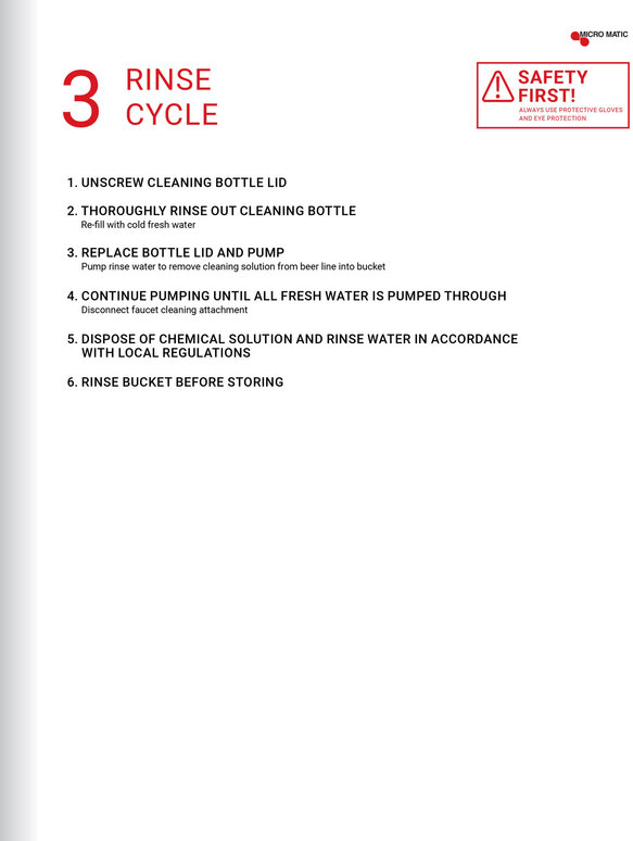 The simple cleaning process takes only a few minutes and is easily accomplished by using either a hand-pumped cleaning bottle or a pressurized cleaning bottle. This process involves pumping water mixed with cleaning chemicals into the beer line and letting it soak for the time prescribed by the chemical manufacturer. Then thoroughly flush the beer line with water to remove all traces of the cleaning chemical.