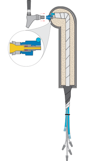 Draft beer towers with Micro Matic’s patented Kool-Rite™ technology provide optimum cooling at the point of dispense. Our innovative modular construction makes installation and service as simple as PLUG “N” POUR. Let’s explore the components of the Kool-Rite™ module beginning at the beer entry point.