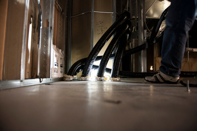 The whole bundle is secured in place with PVC tape. This outer jacket protects the bundle from moisture and pests. Some manufacturers try to shape the outer jacket for less surface area, so it is easier to pull through walls during installation. Typically, one line chiller would be used to cool as many as eight different beer lines. In that case, the bundle would be two glycol lines (one outbound and one inbound) and eight beer lines. Some bundles will have up to 12 beer lines with two glycol loops (four lines).