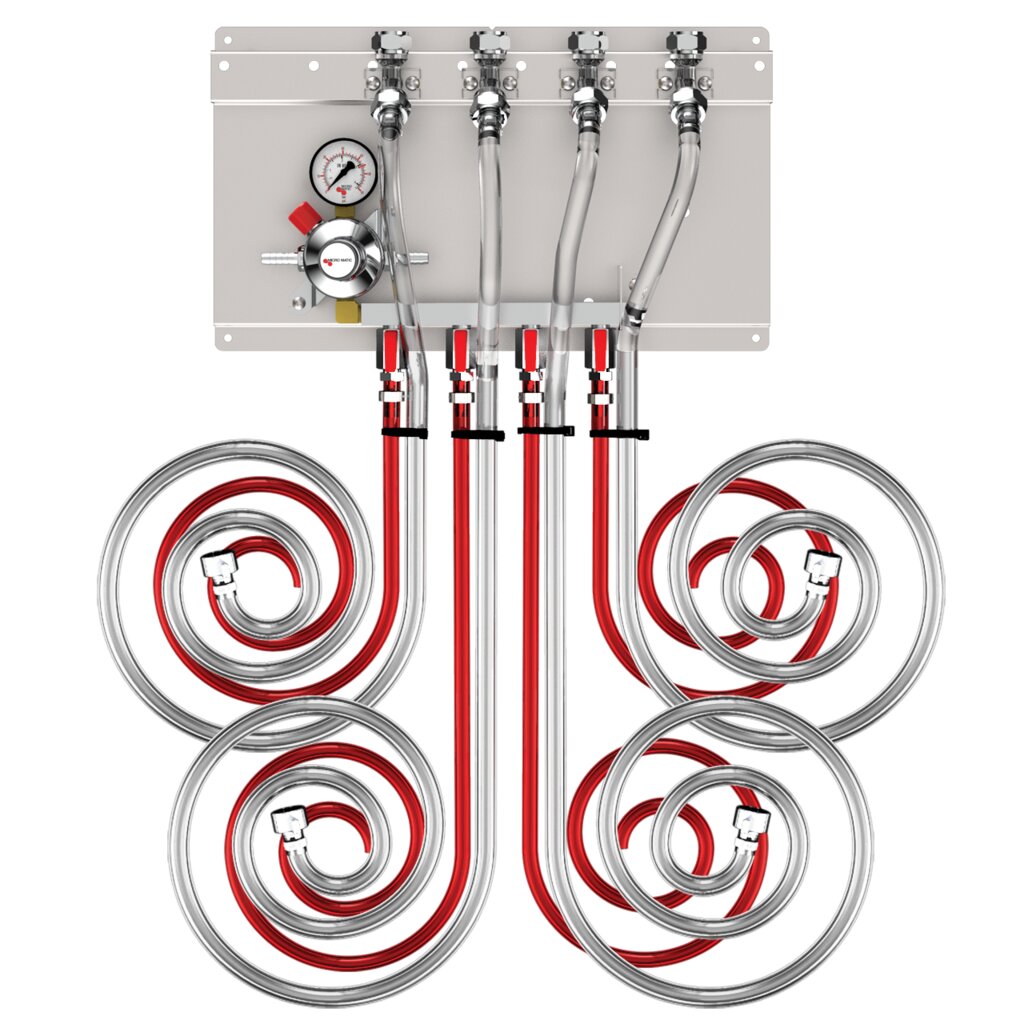 - Single gauge secondary regulator, manifold, beer and gas hoses for kegs, all on one easy mount panel