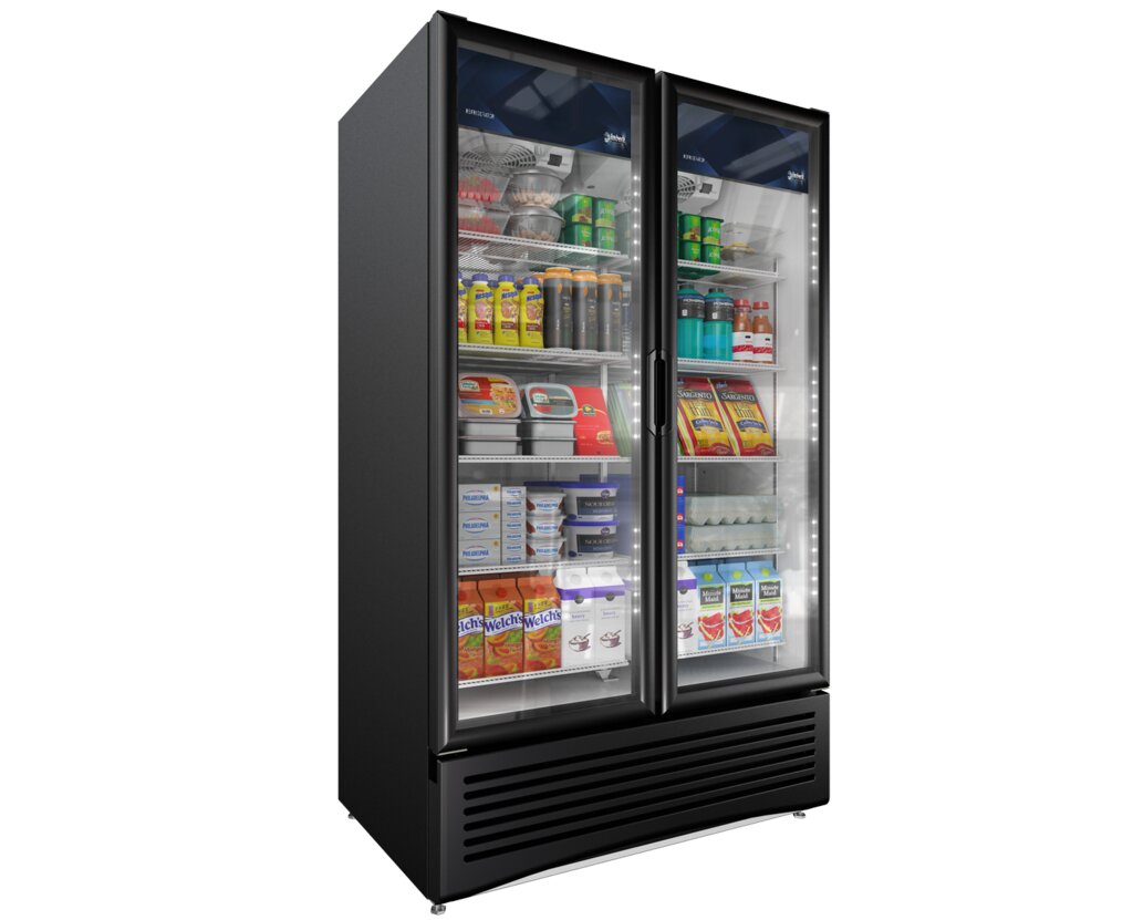 This Imbera® VR37 refrigerated merchandiser is separated into (2) sections and features (10) flat wire shelves that measure 20-1/2 inches wide by 20-5/8 inches deep each to accommodate as many as (490) 20-ounce bottles. To improve product presentation, the interior has a sleek, white appearance, and the LED lighting system highlights displayed contents without using as much energy as fluorescent lights. (2) glass doors built into the unit's front contain low-e film to reduce condensation. (1) door is hinged right, while the other is hinged left, and both have a self-closing mechanism that ensures complete closure to prevent temperature fluctuations. To blend in with common convenience store and front-of-house restaurant decors, this 47-3/8 in. wide by 30-3/8 in. deep by 78-5/8 in. high refrigerator has a black-painted steel exterior.